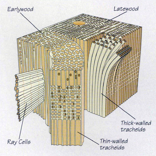细胞构成包括:木纤维、导管、薄壁细胞。