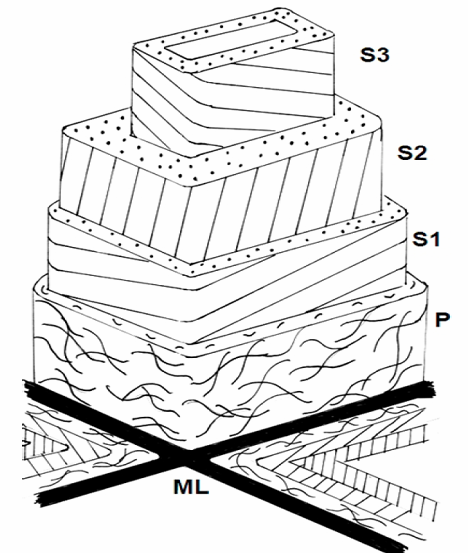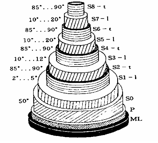 厚度为0.1-0.3µm,纤维素和半纤维素构成。微细纤维的取向为(50-70°或70-90°)、规则交错地缠绕在细胞壁上,形成交叉螺旋。