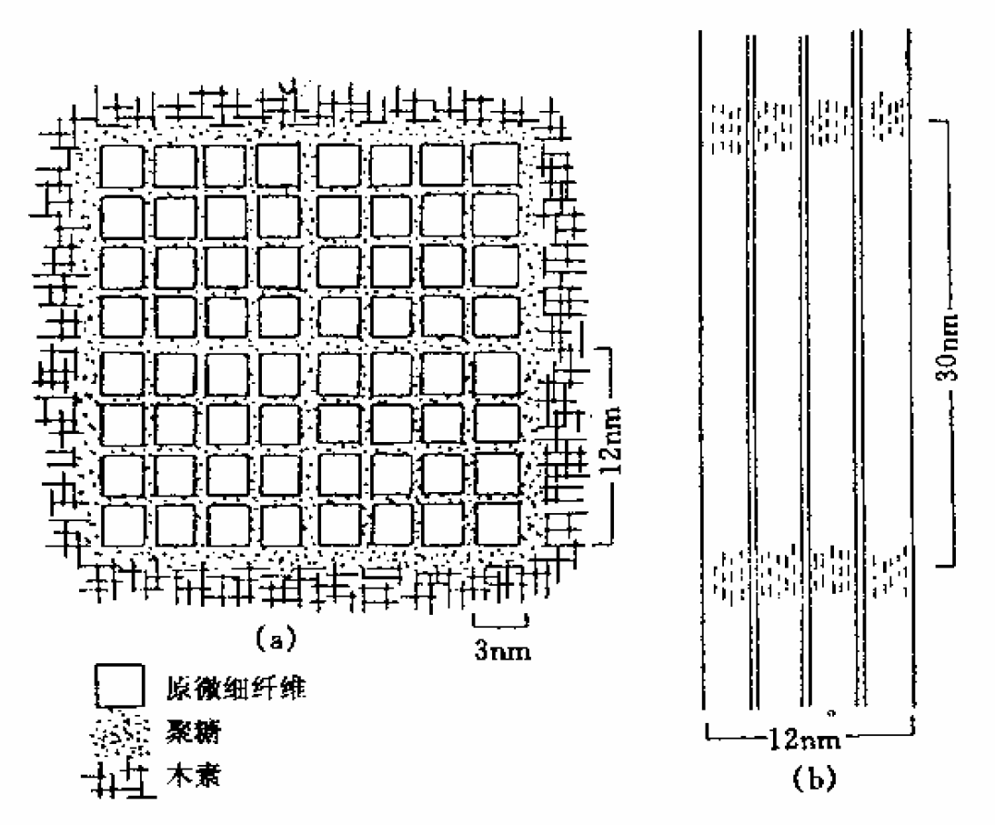 约40个纤维素大分子构成原细纤维(直径约3nm),16根原细纤维组成亚微细纤维或微纤丝(直径约为12nm),再由4根亚微细纤维构成一根微细纤维(直径为25nm)。在原细纤维之间是木聚糖的单分子层,在亚微细纤维之间是几个木聚糖分子层,在微细纤维周围是木聚糖和木素。