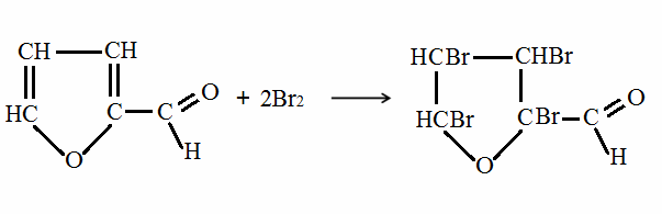 根据鲍维尔和维达克等人的研究,含糠醛的溶液在室温下与过量溴作用1 h,1摩尔的糠醛可与4.05摩尔的溴化合,称为四溴化法。反应式如下: