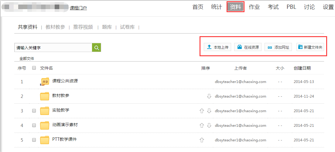 2、用户在上图所示的界面中,可以本地上传资料、搜索在线资源,也可以添加网址,新建文件夹,实现资料共享。