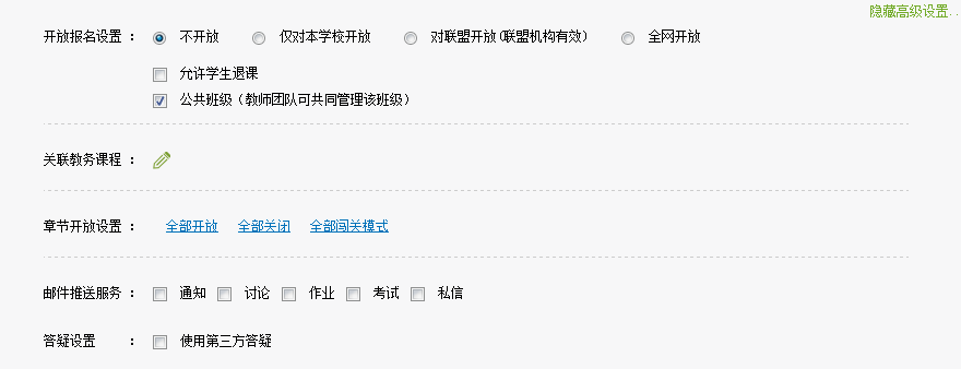 按钮,可对学生管理、教师团队、助教及菜单进行设置,也可进行高级设置,跳转页面如下图。