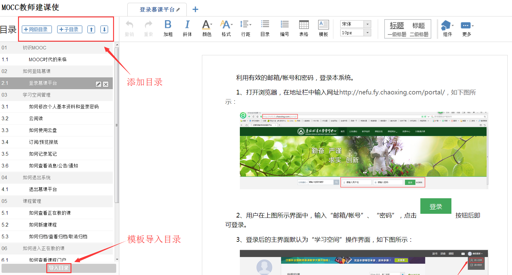按钮,下载模板将课程目录全部导入。用户在上图所示界面中,可对课程目录进行编辑,如目录上移或下移。