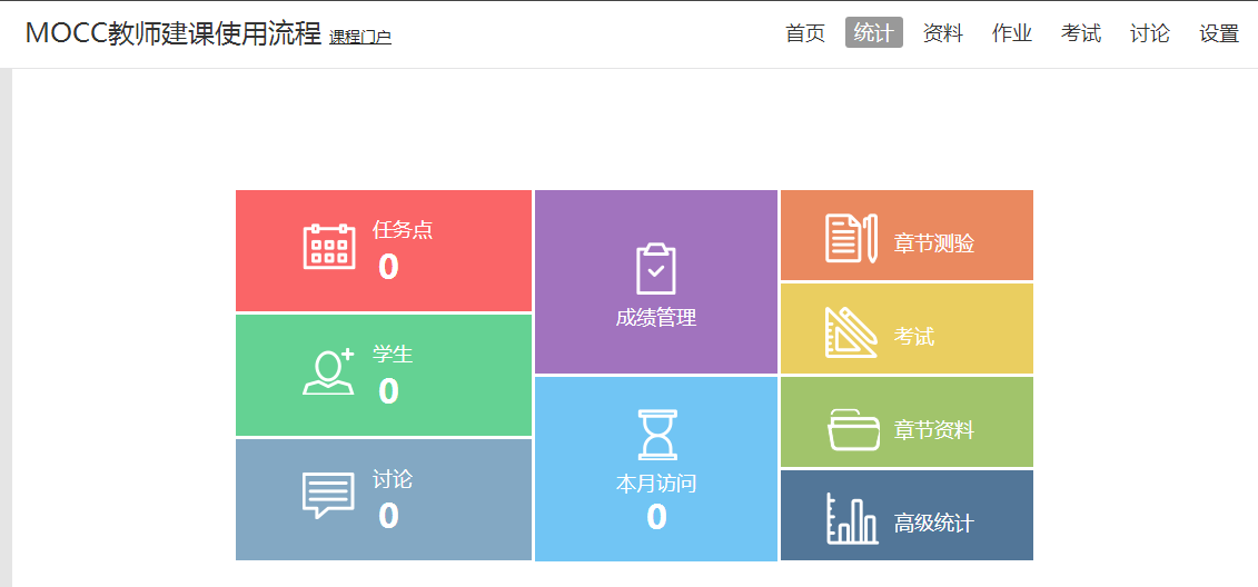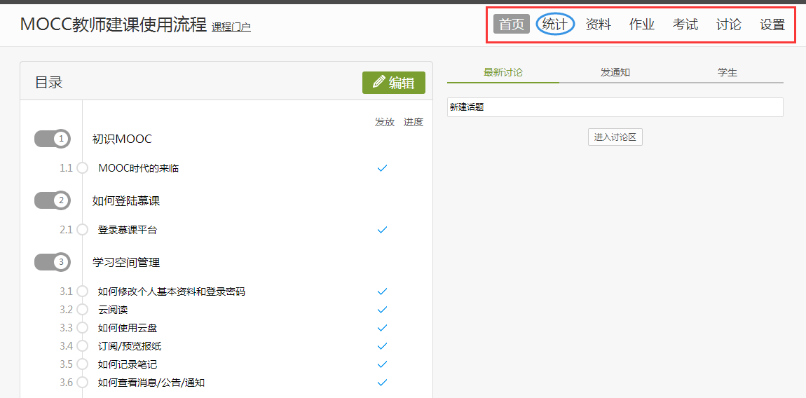 4、用户在上图所示的界面中,可以查看到学生数、访问数、讨论数、任务点、作业数、章节数、视频数、图书数、视频排行榜、任务进度、视频观看时长、课程相关行为轨迹等信息。