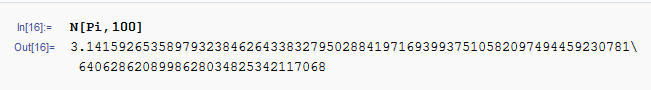 N是表示数值(也就是近似值)的函数。N[expr]表示表示expr的近似值,N[expr, n]表示expr的有n位精度的近似值。比如说,求圆周率的前100位: