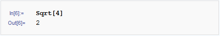 当我们要进行复杂一点的计算时,就要用到数学函数了。与我们平时写数学公式的习惯不同,Mathematica中函数的自变量都括在方括号中,这样是为了与控制运算顺序的圆括号相区别。比如说计算4的算术平方根,就要用到表示平方根的函数Sqrt: