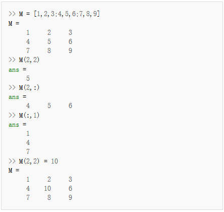 在MATLAB内存取矩阵元素同样非常简单,例如: