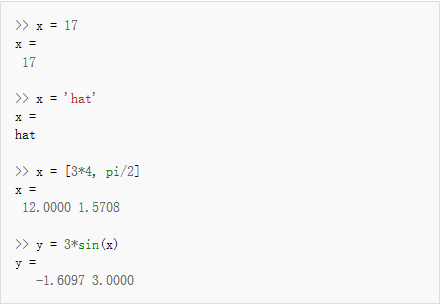 MATLAB的变量名字跟许多程序语言一样,严格区分大小写,例如,var、VAR和Var是三个不同的变量。另外,MATLAB中变量名字必须以字母为首字母,3var、_var等是非法的变量名。 变量由赋值运算符(=)定义. MATLAB是动态检查的,这意味着变量可以在未定义其类型的情况下赋值并且变量的类型也可以改变,除非将变量看做是符号对象[9]。变量值可以取自常量,计算中的其他变量的值,或某一函数的输出。例如: