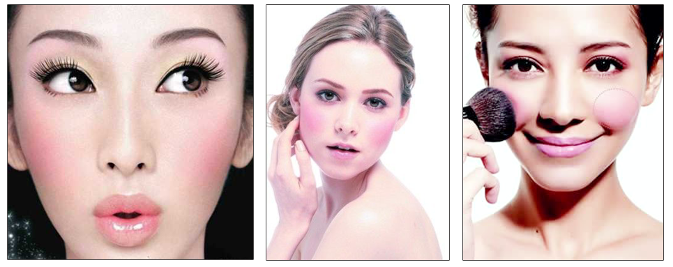 其次、涂抹胭脂时要注意部位及涂抹方向。脸型扁长的人,横抹胭脂可使脸型有缩短的效果;脸型偏宽的人,竖抹胭脂有拉长脸型的效果。