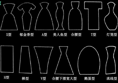 ③O廓形:上装、连衣裙:腰部的夸大,肩部适体,下摆收紧,使整体呈现出圆润的O形观感;下装:腰部适体,臀部夸大、下摆收紧。此廓形的结构线以长弧线为主,是一种休闲、舒适、随意的造型效果。