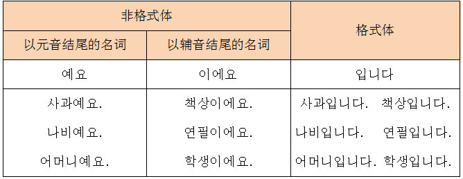 “이다”用在名词之后,使该名词成为句子的谓语,表示句子中的主语和谓语是同一事物,相当于汉语中的“…是…”。“이다”还可以用来具体说明某一事物。在格式体的句子中,它的陈述形是“입니다”,疑问形是“입니까”.在非格式体句子中,它的陈述形和疑问词形一样,都是“예요/이에요”句尾为降调时,“예요/이에요”是陈述形,当句尾为升调时,“예요?/이에요?”,则是疑问形。当“이다”。