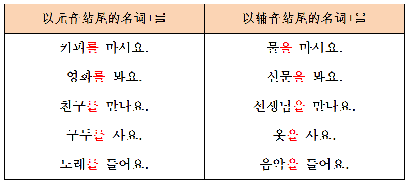 解析:宾语助词“을/를”主要接在名词之后,表示该名词为句子的宾语。当名词以元音结尾时后面接“를”,以辅音结尾时后面接“을”。口语中宾语助词通常可以省略掉。