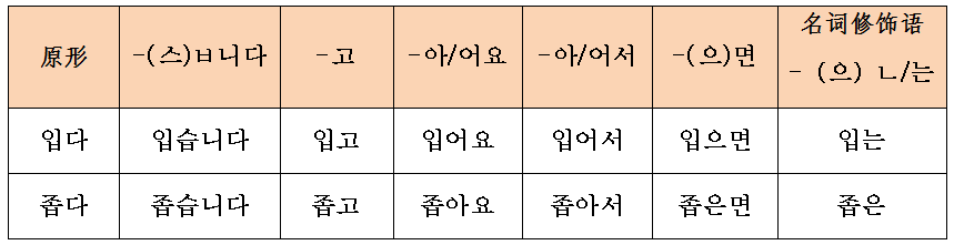 “좁다,입다,씹다,잡다”等虽然词干以“ㅂ”结尾,但是不发生不规则变化。