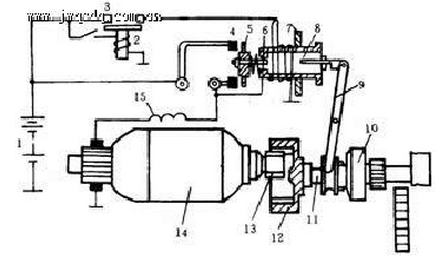 机主要由电磁啮合开关,减速齿轮,电动机、起动齿轮(小齿轮)及单向啮合器等部分组成,如图所示。