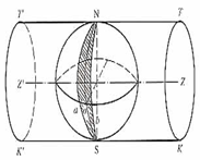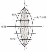 横圆柱投影方法:设想把一个平面卷成一个横圆柱,套在圆球外面,使横圆柱的轴心球的中心,并使横圆柱与球面上的一根中央子午线NOS相切(如图1—4),将球面上的图形投影到横圆柱面上,然后将横圆柱面沿南北极的TT′和KK′切开并展开成平面,即可得投影到平面上相应的图形。此时,中央子午线长度保持不变,赤道与中央子午线为相互垂直的直线(如图1—3)。