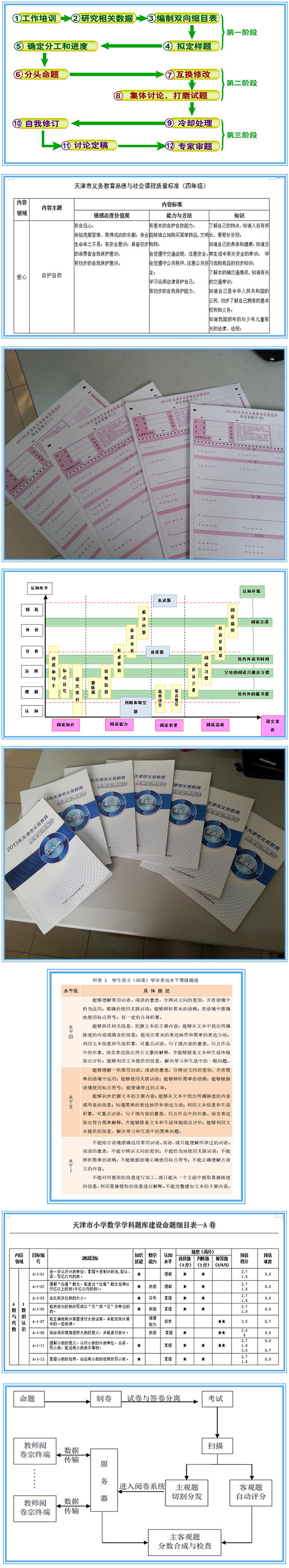 研制质量标准。依据国家学科课程标准(2011年版)、借鉴国际知名评价项目( PISA、 PIRLS、TIMSS)的评价理念、结合天津教学实际,我们研制了学业质量标准和学业等级标准。标准的制定集中了学科、教育测量、教育政策研究等多方面专家的智慧。