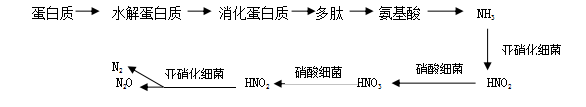 蛋白质(proteins)在微生物所分泌的蛋白质水解酶的作用下水解(水解过程hydrolysis),分解成为简单的氨基酸类含氮化合物。氨基酸在多种微生物及其分泌酶的作用下产生氨(氨化过程ammonification),氨化过程,在好气、嫌气条件下均可进行,只是不同种类微生物的作用不同,在通气良好的情况下,氨化作用产生的氨在土壤微生物的作用下,可经过亚硝酸的中间阶段,进一步氧化成硝酸(硝化过程nitrification),在通气不良的土壤中,硝酸盐会转化成亚硝酸盐的作用称为亚硝化过程。(所有反应式见教材)。