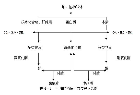 第二阶段是合成阶段。即由芳香族物质(多元酚)、含氮有机化合物(氨基酸或肽)缩合为腐殖质分子。在这个过程中微生物起着重要作用,首先,在碱性条件下,多元酚类在微生物(细菌、霉菌等)分泌的多酚氧化酶的作用下,氧化成醌,然后醌类在微生物的多种酶促反应作用下,再与氨基酸类含N化合物缩合成腐殖质的单体分子。腐殖质形成的生物化学过程如图4—1所示。
