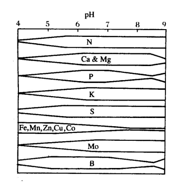 钾(potassium):在土壤pH值≤5时,因钾的淋失而可能使土壤缺钾。当土壤pH值增高时,土壤含盐基亦高,钾的有效性增大。实际上pH值增加至6以后,以及在中性和碱性范围中,钾的有效性一直是良好的。