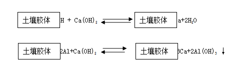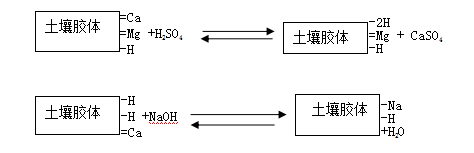 土壤胶体吸附有H+、K+、Ca2+、Mg2+、Al3+等多种阳离子。由于这些阳离子有交换性能,故胶体上吸附的盐基离子能对加进土壤的H+(酸性物质)起缓冲作用,而胶体上吸附的致酸离子能对加进土壤的OH+(碱性物质)起缓冲作用。其反应如下式所示: