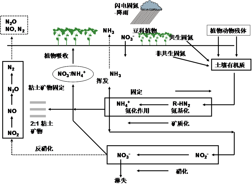 图3所描述的氮素循环表明,土壤中氮素的循环过程有以下几个方面: