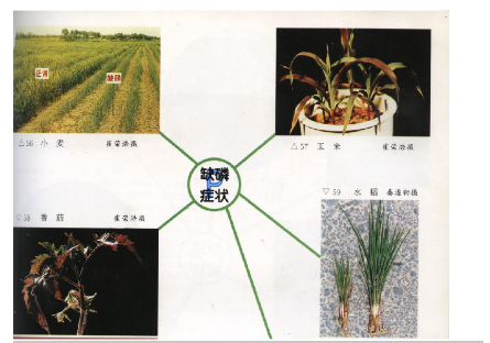 磷是细胞核的成分之一,在果实及种子里含有较多的磷,磷对细胞分裂和植物器官的分化,特别是开花结果起着重要作用。磷对提高植物的抗病性、抗 性和抗旱能力有良好的作用。植物缺磷(图4)抑制体内细胞分裂,使生长缓慢,缺磷体内植物蛋白质合成减慢,有氨基酸积累,同时营养器官内含有大量糖类,有利于叶内合成花青素,使叶子呈紫色、深绿色,根系发育不良,植株表现矮化现象,结实率下降。