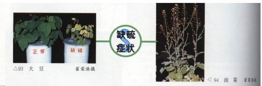 硫是合成氨基酸如半光氨酸,光氨酸,蛋氨酸必需的元素。硫也是联合酶A合成的必需元素之一,从而参与脂肪酸,氨基酸的合成和氧化,以及柠檬酸循环中的中间产物的氧化。叶绿素的合成也需要硫。植物含硫(图9)量一般在0.1-0.5%。