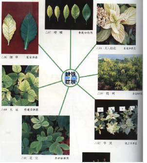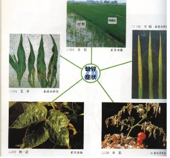 11.3.3.锌(zinc): 锌参与许多酶的活动, 对激素的合成起促进作用。 缺锌(图12于生长素合成的降低将导致植物出现节短, 小叶病, 叶斑病等。