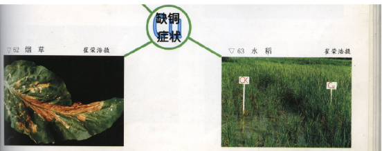 土壤溶液中 pH:pH值增加一个单位, 三价铁的含量将降低1000倍, 二价铁的含量将降低100倍。南方酸性土壤一般不缺铁, 但干旱或半干旱地区的碱性土壤则通常可能出现缺铁(图11)常的土壤pH值范围内, 土壤中可溶性的铁不能满足植物的生长需要。