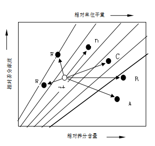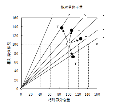 上图中,X轴代表相对养分含量,Y轴代表相对养分浓度,Z轴代表相对单位植物样品干重。作图时,X和Y轴取相同的刻度很有意义,这样便于使对照点引入后形成一个正方形,并画出对角线,标示出对照点的X、Y和Z值。其余的对角线从X轴原点相对于通过参考点的对角线引出形成。这些对角线最好等间距绘出,亦可按实际单位干重而准确绘制。