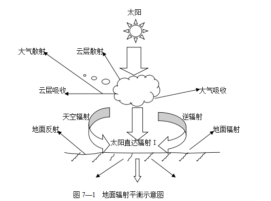地面辐射平衡示意如图7—1。太阳辐射透过大气层时,大部分被大气中的水汽、云雾、CO2、O2、O3和尘埃等吸收、散射和反射,只有少部分直接到达土壤表面。直接到达地表的太阳能称为太阳直接辐射(I)。被大气散射和云层反射的太阳辐射能,通过多次的散射和反射,又将其中的一部分辐射到地球上,这部分辐射能是太阳的间接辐射能,一般称为天空辐射能,或大气辐射(H)。