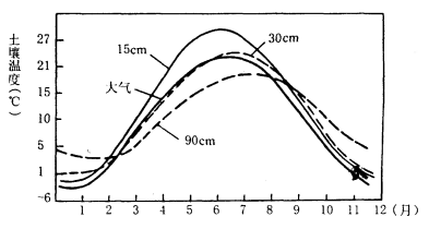 土壤表层温度随气温的变化而起伏波动,不同深度土壤温度的月变化如图7-3。深15cm表土层的平均温度在全年较气温为高;心土温度比气温则秋冬高,春夏低。一般来说,一年的月平均温度,除表土层温度在短时间内的变化可能很大外,心土的温度变化是相对平缓的,土温的全年变化是在晚秋一冬天一早春,表土层温度低于心土层;而在晚春-春天-早秋,则表土层温度高于心土层。土温季节变化的变幅随深度的增加而减小在高纬度消失于25m深处,在中纬度消失于15~20m深处,在低纬度则消失于5~10m深处。