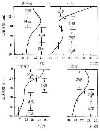 不同深度土壤温度的日变化如图7-4。由于土壤热量主要来自太阳辐射,在温带地区太阳辐射使气温从早晨开始上升,到下午2时左右达到最高温,表土温度也随之上升。但由于土温的滞后现象,通常要在下午2时后或更迟的时间才达到最高温度。在晚间,土表温度常比次表层或心土层低。在较深的土层中,例如在离地表10~20cm处,土温的日变幅显著缩小,而且最高、最低温度出现时间亦逐渐推迟。土温的昼夜变幅随深度的增加而缩小,在一般情况下,80~100cm以下土层的温度昼夜变化就不明显了。