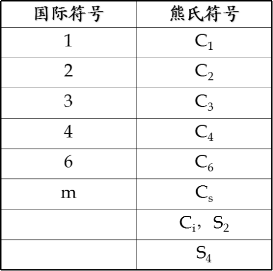 ◎ Cn:字母表示旋转的意思,组标n表示旋转的次数,n=1、2、3、4、6。例如C2代表二次旋转轴。