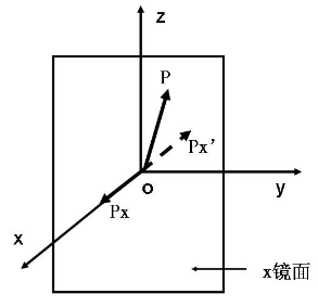 设x面为对称面,根据对称面的对称性要求,当晶体的坐标由x®-x、y®y、z®z时,晶体的性质应保持不变。如果在对称面的一侧,例如x方向,存在一个电偶极矩Px,则在对称面的另一侧,-x方向,也一定存在一个大小相等、方向相反的电偶极矩P’x(如图4-4所示),才能满足x面是对称面的对称性要求。