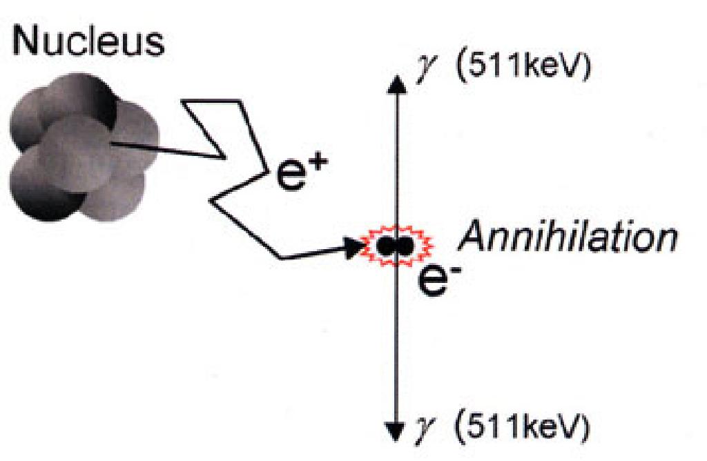 原子核发射的正电子与电子碰撞,质量消失(湮灭),同时释放两个相同能量γ光子的过程。