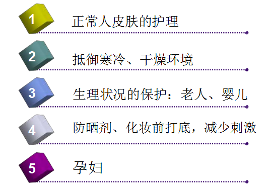 1.婴儿、老人皮肤脆弱,抵御风寒、干燥能力差,要多使用保湿霜。婴幼儿皮肤天然保湿因子、透明质酸都很丰富,但皮脂含量不足,皮肤屏障薄弱,保湿霜的成分应该简单主要是补充脂质,增强皮肤屏障,原料的安全性高。