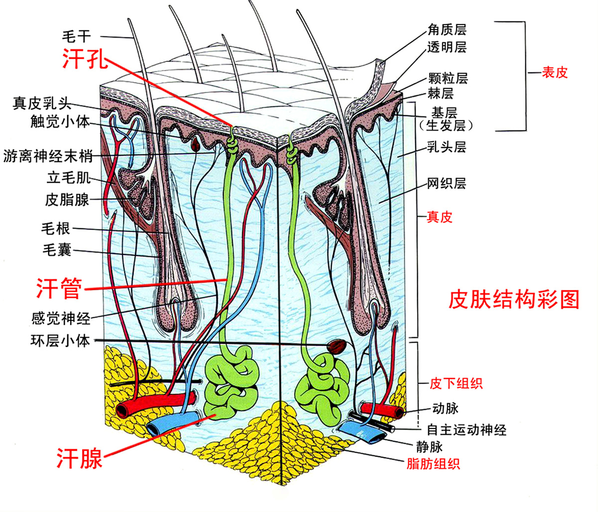 皮肤中有丰富的血管、淋巴管和神经分布,皮肤血管对皮肤颜色、温度调节、皮肤代谢和对透皮转运等起着重要的作用。