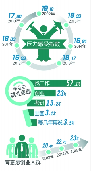 法制晚报讯(记者周超)2015中国大学生就业压力调查报告昨天发布,大学生平均期望月薪5510元,为近5年来首次上涨。而就业压力也仅次于受金融压力影响的2009年,创6年新高;而有创业意愿的人群比例也达近年最高。