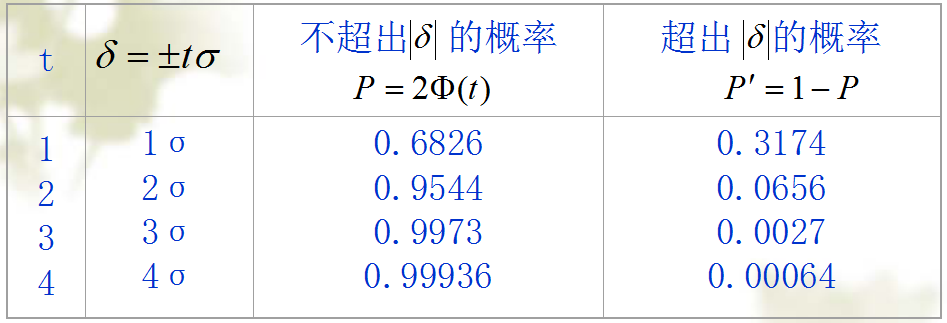 从表3-4中误差估计的置信系数 t与概率的数值关系上可以发现:超出±3σ的概率只有0.27%。可以近似地认为超出±3σ的可能性为零。