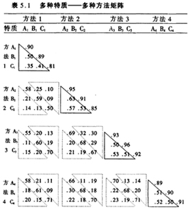 多种特质——多种方法矩阵法。该方法的实质是相容效度和区分效度法的综合运用,其原理是若用多种极不同的方法测量同一种特质相关很高(用极为相似的方法测量不同特质相关很低),则说明测量效度较高。于是,若有多种特质都接受了多种方法的测查,就可以分别计算出任意两种方法测量同一特质的相关和测量不同特质的相关,以及任意两种特质接受同一方法和不同方法的相关,并以这些相关系数为元素构成一个矩阵,从而得到测验效度的指标。