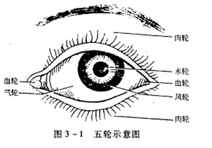 五轮学说是根据眼与脏腑密切相关的理论,将眼局部由外至内分为眼睑、两眦、白睛、黑睛和瞳神等五个部分,分属于五脏,分别命名为肉轮、血轮、气轮、风轮、水轮(见图3—1),借以说明眼的解剖、生理、病理及其与脏腑的关系,并用于指导临床辨证的一种学说。