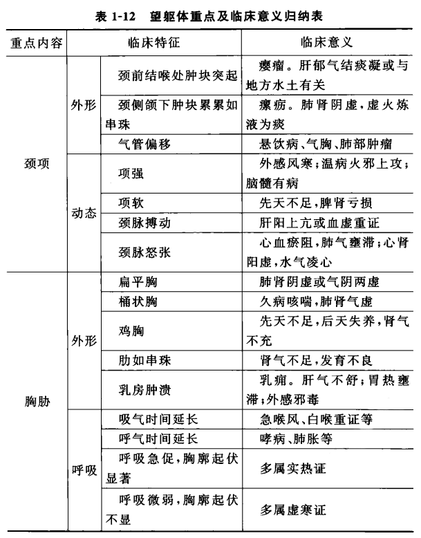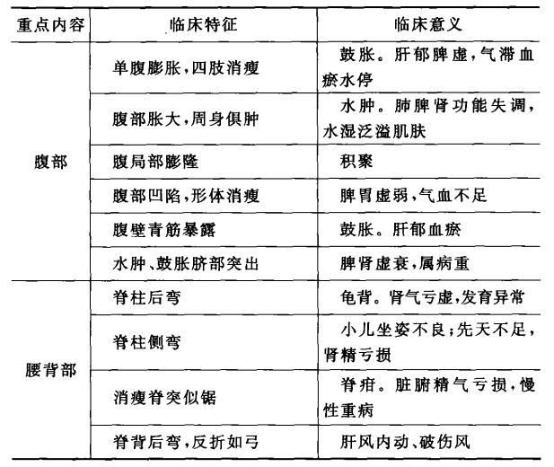 观察颈项、胸胁、腹部、腰背部等异常变化,重点诊察相应脏腑及经络的病变(见表1-12)。