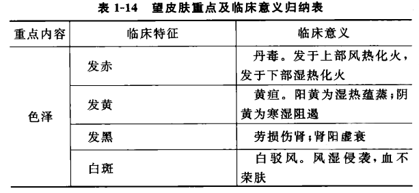 观察皮肤的色泽、形态变化,诊察肺和其他脏腑病变(见图表1—14)。