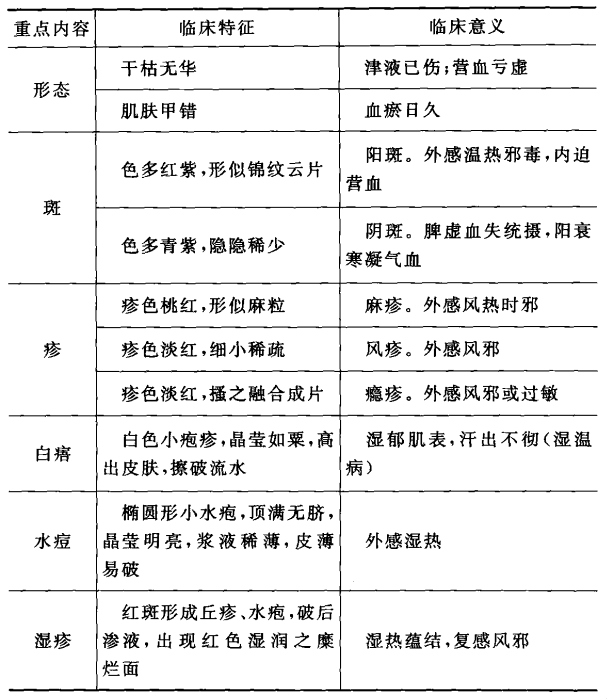望诊时应注意观察皮肤色泽形态的变化和表现于皮肤的某些病证,如斑、疹、痘、痦、痈、疽、疔、疖等。