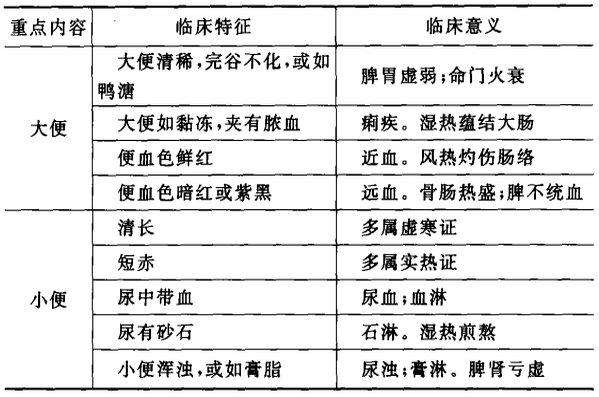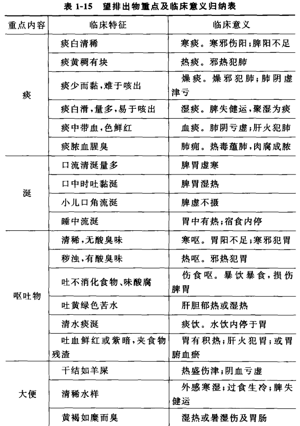 2.观察病人的分泌物、排泄物和某些排出体外的病理产物的形、色、质、量的变化,诊察脏腑、津液的病变(见表1—15)。