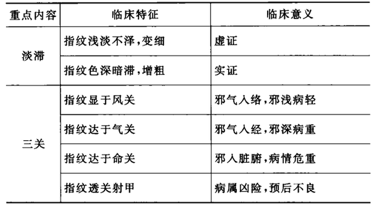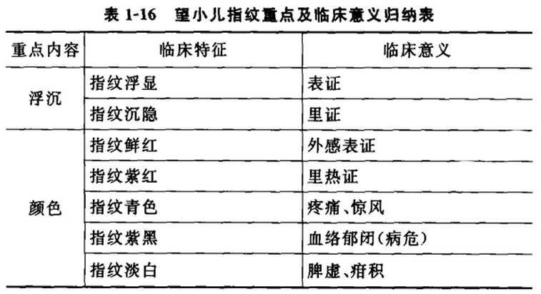 观察小儿食指内侧前缘浅表络脉的形色变化,诊察脏腑气血的盛衰,疾病的病位、病性,判断病情的轻重和预后(见表1—16)。
