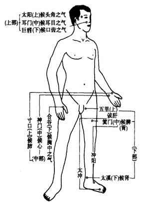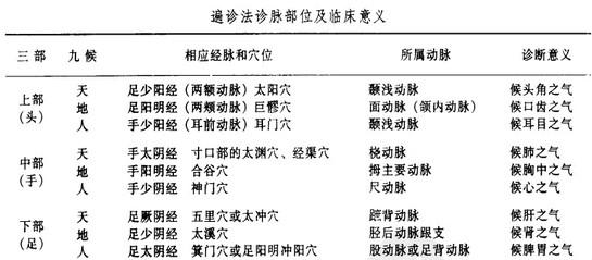 上部天是指两侧颞动脉,可以反映头额及颞部的病痛;上部人是指耳前动脉,可以了解目和耳的情况;上部地,是指两颊动脉,可以了解口腔与·牙齿的情况。中部天,是手太阴肺经的动脉处,可候肺气;中部人,是手少阴心经的动脉处,可候心气;中部地,是手阳明大肠经的动脉处,可候胸中之气。下部天,是足厥阴肝经的动脉处,候肝气;下部人,是足太阴脾经或足阳明胃经的动脉处,候脾胃之气;下部地,是足少阴肾经的动脉处,候肾气。诊察这些脉动部位的脉象,可以了解全身各脏腑、经脉的生理病理状况。《素问·三部九候论》说:“人有三部,部有三候,以决死生,以处百病,以调虚实,而除邪疾。”可见三部九候诊法是一种最古老的诊脉方法,其用义是何处脉象有变化,便可以提示相应部位、经络、脏腑发生病变的可能,而不是用一处或几处脉象来测知全身情况。