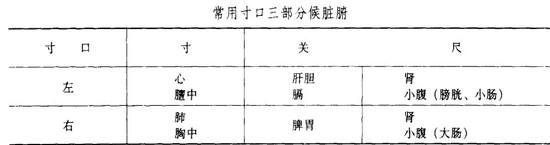 现在临床上一般是根据《内经》“上竟上”、“下竟下”的原则,即上(寸脉)以候上(身躯上部),下(尺脉)以候下(身躯下部),来划分寸口三部所分候的脏腑:左寸候心,右寸候肺,并统括胸以上及头部的疾病;左关候肝胆,右关候脾胃,统括膈以下至脐以上部位的疾病;两尺候肾,并包括脐以下至足部疾病。