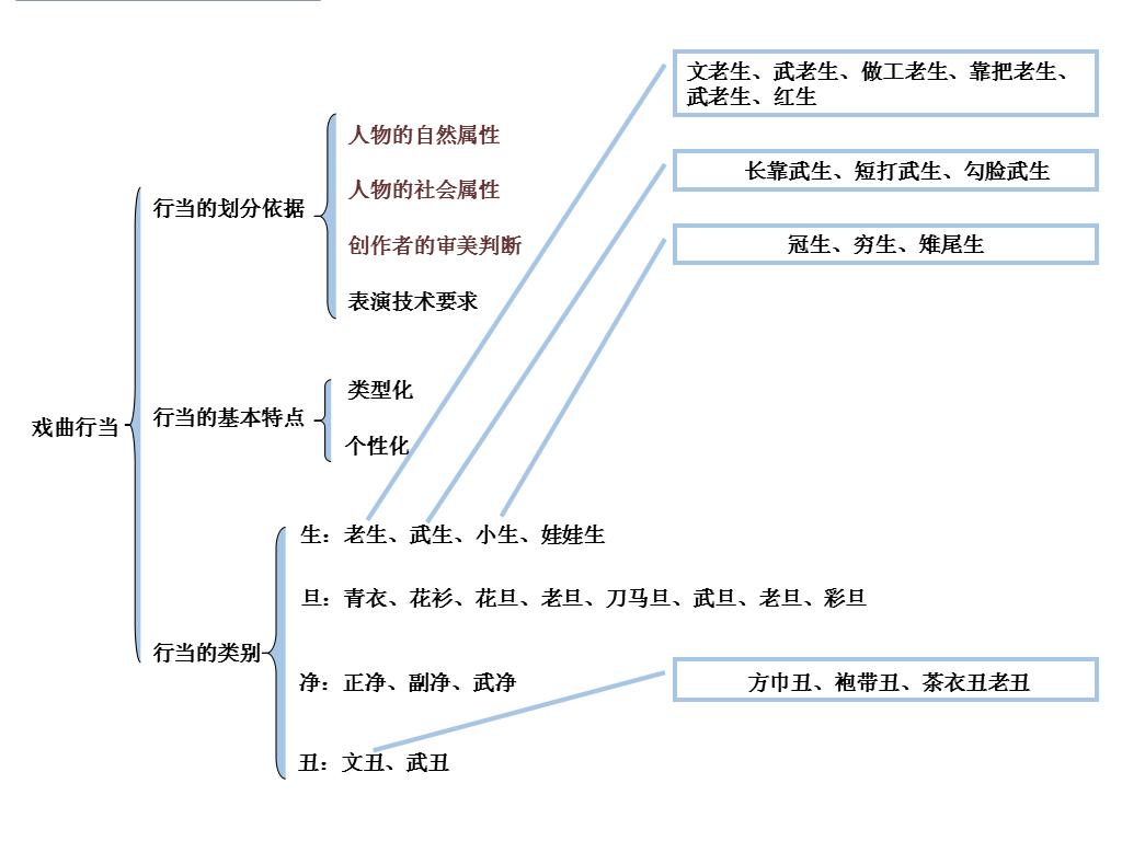 中国戏曲中人物角色的行当分类,按传统习惯,有“生、旦、净、丑”和“生、旦、净、末、丑”两种分行方法,近代以来,由于不少剧种的“末”行已逐渐归入“生”行,通常把“生、旦、净、丑”作为行当的四种基本类型。每个行当又有苦干分支,各有其基本固定的扮演人物和表演特色。其中,“旦”是女角色的统称;“生”、“净”、两行是男角色;“丑”行中除有时兼扮丑旦和老旦外,大都是男角色。